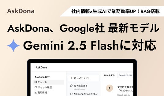 株式会社GFLOPS(本社:東京都渋谷区、代表取締役CEO:盛本マリア)は、法人向け生成AIプラットフォーム「AskDona」のGPTチャット機能において、Google社の最新モデル「Gemini 2.5 Flash」に対応したことをお知らせいたします。