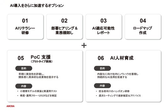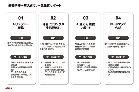 株式会社ARCRA(東京都文京区 / 代表取締役CEO 藤本秦平)は、企業のAI導入における課題を解決するための新サービス「AI導入パッケージプラン」を開始しました。