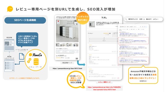 また、ReviCoのSEOオプションを利用することで、レビュー専用ページを別URLで生成し、インデックス数を2倍にしつつレビュー内のキーワードも検索対象とすることで、流入数の増加を実現しています。