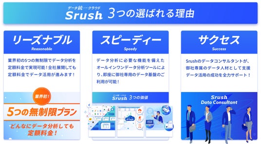 データ人材がいなくてもデータ活用が進むオールインワンデータ分析ツールデータ統一クラウド「Srush」と、データ基盤の構築からデータ活用の定着支援まで行う「コンサルティングサービス」を提供しています。加えて、業界初の無制限プランの提供、AIを活用して分析の自動化やデータ加工の効率化を図ることで、データ活用を阻む「ヒト・モノ・カネ」の問題を解決し、中小企業のデータドリブン経営の実現に貢献します。