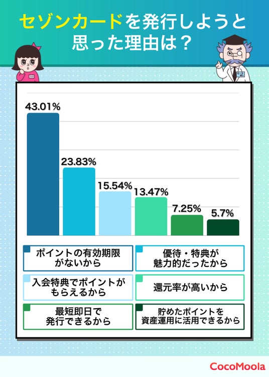 - セゾンカードを発行しようと思った理由は「ポイントの有効期限がないから」が約43%の回答を集め、「永久不滅ポイント」を評価する声が多いことがわかる