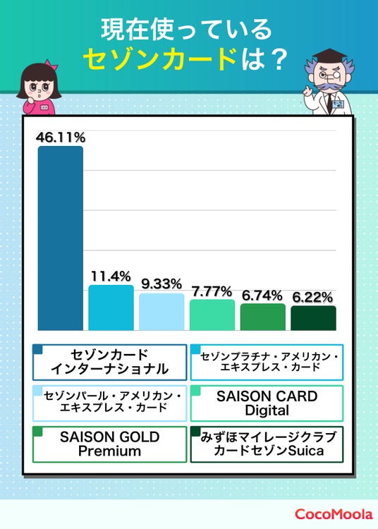 - 最も使われているセゾンカードは「セゾンカードインターナショナル」で回答者全体の約46%が所持