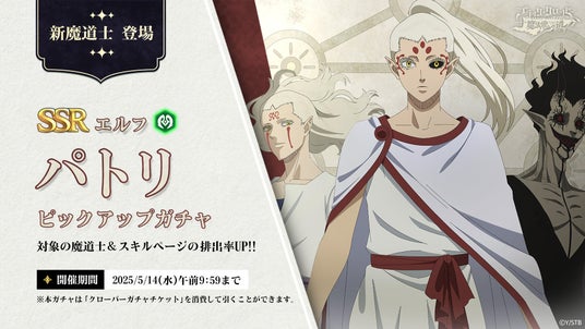株式会社VIC GAME STUDIOS JAPAN(東京都新宿区、代表取締役:李 同校)は、テレビアニメ『ブラッククローバー』のアプリゲーム『ブラッククローバーモバイル 魔法帝への道 The Opening of Fate』(以下、ブラクロモ)において、本日4月22日(火)よりSSR魔道士「《エルフ》パトリ」と魔道士スキルページ「光の世界」が新登場したことをお知らせいたします。
