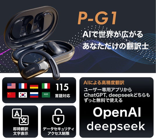 ■ 話すだけで翻訳、耳をふさがず自然な会話を実現 「MONOiSE P-G1」は、ChatGPTとDeepSeekの2つのAIを手動で切り替えながら使える、リアルタイム翻訳イヤホン。イヤホンを装着したまま話すだけで、115の言語を瞬時に翻訳。さらに、AIモードでは文章作成や画像生成など、生成AI機能も搭載。