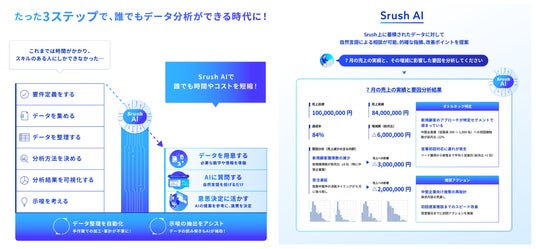 - 対話型データ分析機能:「データ統一クラウド」にあるデータをSrushAIが横断的に分析し、自然言語での問いかけに応じてグラフ化や分析を実行