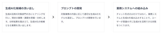 過去のご支援や弊社内における生成AIの活用から得られたユースケースを活かして、企業の業務・システムに最適化した生成AIの利用方法を提案します。