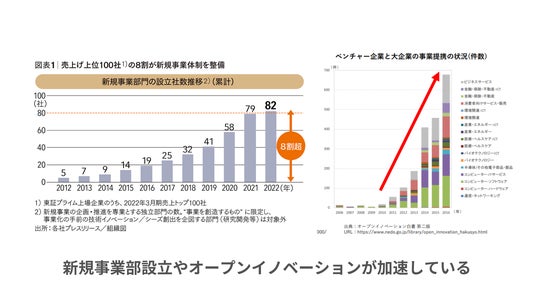 1.左図 大企業の8割が新規事業部門を整備(出典:各社プレスリリース/組織図)2.右図 オープンイノベーション件数が30倍へ(出典:オープンイノベーション 白書 第二版)
