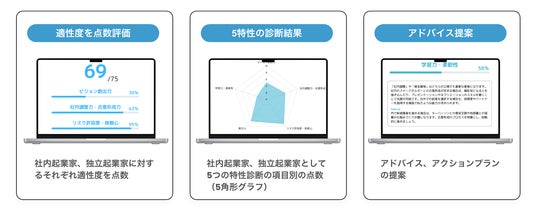 実際に起業家・社内起業家としてご活躍、育成されているピーター・D・ピーダーセン 氏、本多 達也 氏(Social Intrapreneur School 様)と診断ツールを共同開発を進めております。事業開発人財としての行動特性を数値化(レーダーチャート形式)し、直感だけに頼らない客観的な評価を実現しています。