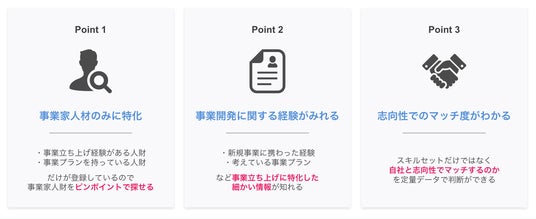 事業を作れる事業開発人財に特化をしており、事業立ち上げ経験だけではなく特性でのマッチ度を事前に判断して探せるサービスです。