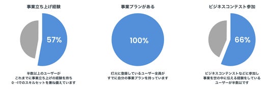 新規事業部ですでに経験を積んでいる人や、すでに事業プランを持っている人のみが登録できるため、新規事業部所属、ビジネスコンテスト出場経験あり、過去に起業経験があるなど、事業開発ができる優秀な人財が集まっていることが灯火ユーザーの特徴です。