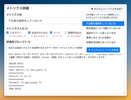 当社ツールCitadel Lensでは、生成AIシステムの検証を行う際、お客さまごとのユースケースにあわせたカスタムメトリクス(オーダーメイドの評価指標)を簡単にチューニングした上で、評価レポートを作成することができます。