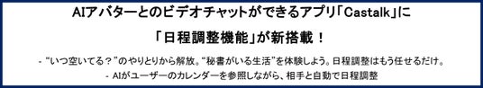 株式会社CASTALK(所在地:東京都港区、代表取締役:戸叶悠莉菜)は、AIアバターとコミュニケーションができるビデオチャットアプリ「Castalk(キャストーク)」において、新機能「日程調整機能」の提供を開始いたしました。
