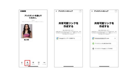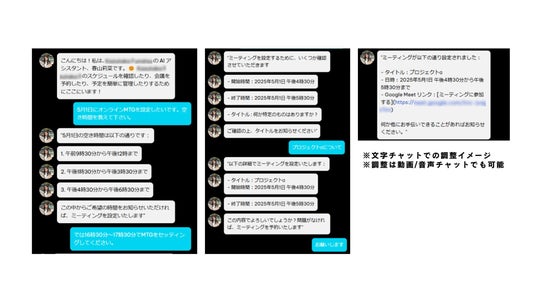 「日程調整機能」は、ユーザーのGoogleカレンダーと連携し、AIアバターがスケジュール調整を代行する新機能です。ユーザーはアプリ上で専用の日程調整用リンクをワンタップで発行し、ゲスト(友人・取引先など)に送るだけ。ゲストはLINE公式アカウントまたはWEBページを通じて*3、秘書アバター”とやりとりしながら最適な日時を決めることができ、確定した予定はGoogleカレンダーに自動登録されます。まるでユーザー専属の“秘書”のように、日程の候補を会話の中で引き出し、空き状況と照らし合わせたうえでスムーズに予定を確定させることが可能です。