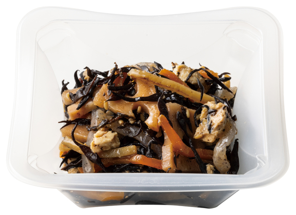 「6種具材のひじき煮」は、ひじき、人参、ごぼう、こんにゃく、レンコン、豆腐の6種の具材を丁寧に煮込み、それぞれに味がしっかりとしみ込んだ、かつおの風味香る和惣菜。
