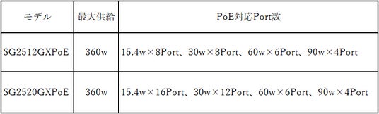 SG2512GXPoE(8ポートPoE)、SG2520GXPoE(16ポートPoE)のPoE(Power over Ethernet)モデルも順次販売開始する。