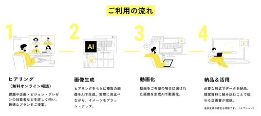 新規事業や広告提案の企画書に入れるイメージやコンテを生成AIで可視化するサービスです。「動く企画」「伝わるビジュアル」で承認率・受注率を底上げします。新規事業の承認、競合プレゼン、資料作成の工数削減など、様々な目的・場面でご活用いただけます。
