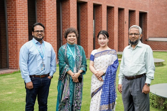 MOU締結後、ULAB構内にて撮影 - 写真左から:Dr. Muhammad Golam Kibria(ULAB教授・CSE専攻)、Jennifer Hossain(ULAB国際部長)、VENTURAS代表取締役社長 上田代里子、Prof. S. M. Mahbubur Rahman(ULAB理工学部長/EEE専攻長)。