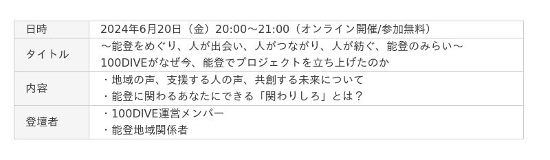 ※「能登プロジェクト」は100DIVE 9期プロジェクトとして開催をします。