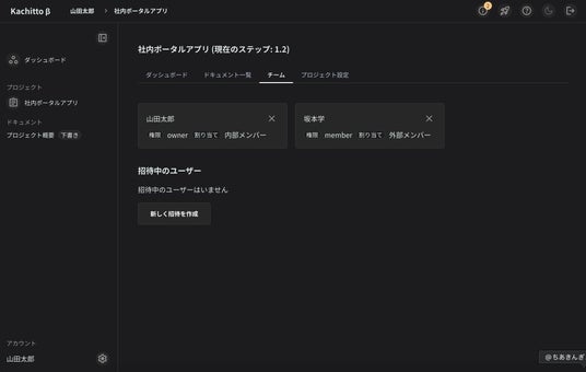 コラボレーションと役割管理プロジェクト毎にチームメンバーを招待することができるため、発注側、受注側が双方で共通のドキュメントを管理することが可能です。チームメンバーは内部のメンバー、外部のメンバーと割当ができるようになっており、ドキュメントを作成する担当も明確になっています。