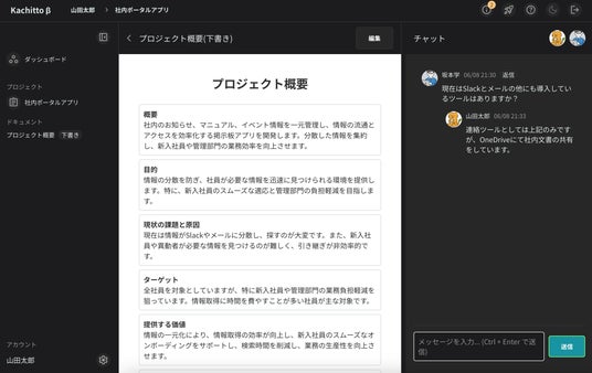 「Kachitto」は、ソフトウェア開発における企画書作成・要件定義・非機能要求の整理といった初期フェーズを、AIによる対話型サポートで自動化するクラウドツールです。開発プロジェクトの立ち上げ時にありがちな「目的の言語化が難しい」「要件がブレる」「関係者間で認識がずれる」といった課題に対して、生成AIが最適な章立てでドキュメント構成を提案し、対話形式で内容を整理・具体化していきます。