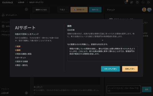 AIによるドキュメント作成支援簡単な質問に答えるだけで、プロジェクトの目的や背景、課題を整理し、企画書や要求定義にまとめます。約8割が既に出来上がった状態で始めることができるため、コストカットが望めるほか、AIによる支援で検討漏れの早期発見にも役立ちます。