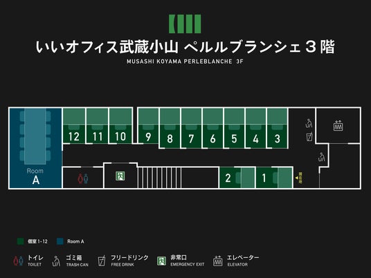 1名用の完全個室12席、8名用の会議室1部屋をご用意。24時間利用可能で、年中無休なため、いつでも気軽にご利用いただけます。
