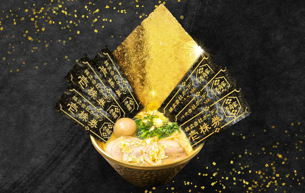 運営元であるガーデンの東証スタンダード市場上場を記念したもので、“金”をテーマにした豪華仕様のラーメンです。金色の器にラーメンを盛り付け、「壱株券」と書かれた海苔6枚、大きな“金色の海苔”、さらには金箔があしらわれています。