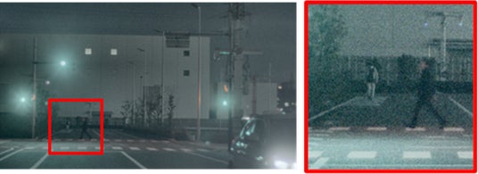 0.1lux(※1)の低照度下で120m先の歩行者を検知することが可能(焦点距離25mm、開放F値1.4で撮影)