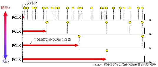 しかし、従来高照度下では、入射したフォトンが一定数を超えると処理のスピードが間に合わずにそれぞれを分離して検出できなくなり、画像が白飛びしたり、フォトンを1つずつ全てカウントすることで消費電力が大きくなるという課題がありました。