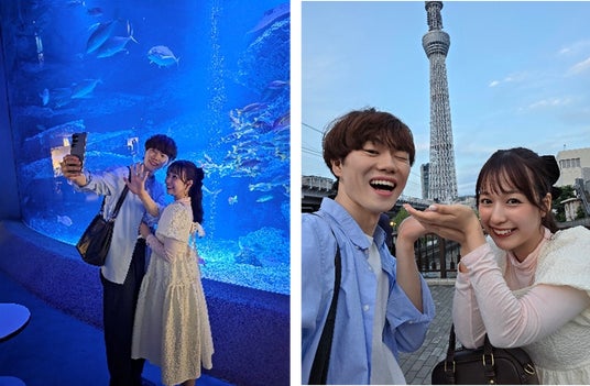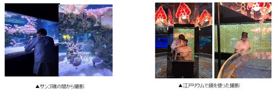 すみだ水族館のサンゴ礁のエリアでは、サンゴ礁の間からお互いに顔を出して撮影することで、まるで海の中にいるような写真を撮影することができます。
