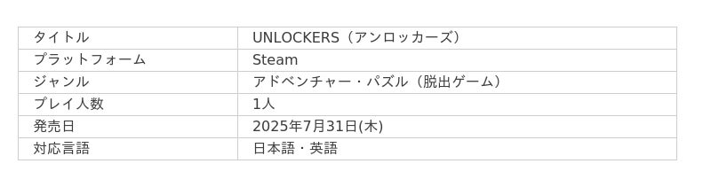 株式会社ヴェルクス・スタジオ(本社:東京都渋谷区、代表取締役社長:五十嵐翔、以下「ヴェルクス・スタジオ」)は、2025年7月31日にスタジオ完全内製タイトル第1弾としてワンルーム謎解き脱出ゲーム『UNLOCKERS』をSteamにて発売することをお知らせします。これに伴い、『UNLOCKERS』のSteamページを公開し、ウィッシュリスト登録を開始いたしました。
