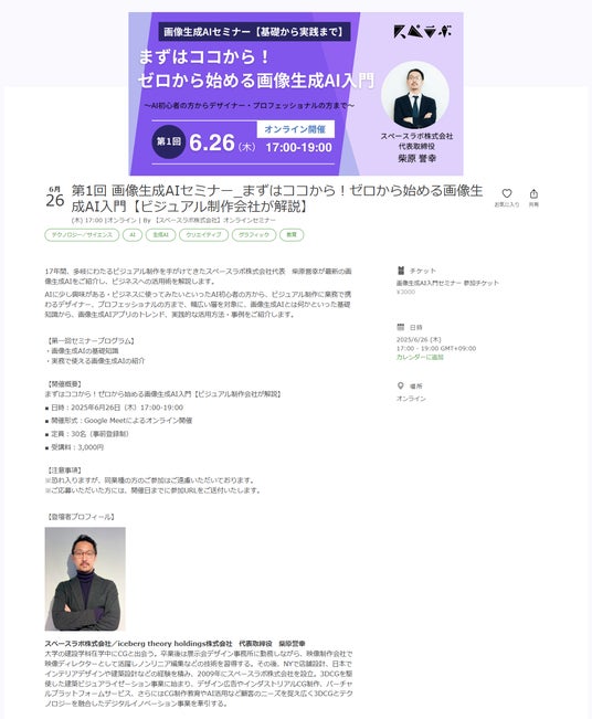 iceberg theory holdings株式会社の子会社として、建築から広告、VRまで多角的なビジュアル体験を提供するスペースラボ株式会社(本社:東京都港区、代表取締役:柴原誉幸)は、2025年6月26日(木)に、第一回オンラインセミナー「まずはココから!ゼロから始める画像生成AI入門【ビジュアル制作会社が解説】」を開催いたします。