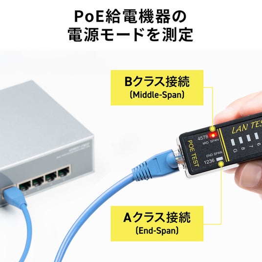本製品はPoE(Power over Ethernet)の電源モード(Aクラス/Bクラス)を判別可能。ネットワークカメラやアクセスポイントなど、PoE対応機器の設置時やトラブル時に役立つ一台です。PoE環境のチェックもこれ一台で完結します。