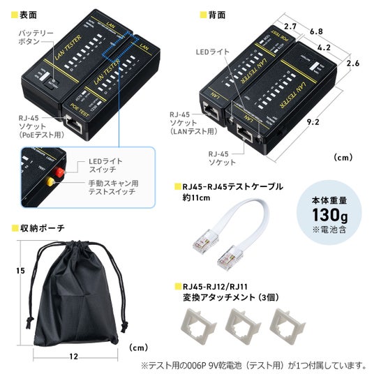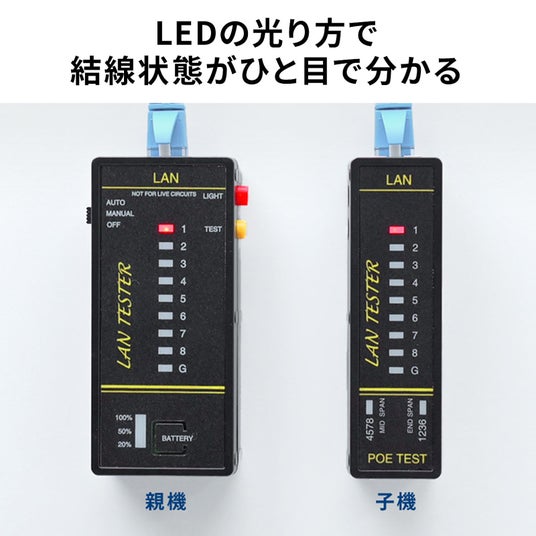 LANテスター PoEチェッカー機能 RJ-45 RJ-11 親機・子機脱着可 マグネット取付け LED表示 LEDライト内蔵 9V乾電池 電池残量LED 型番:500-LANTST5 販売価格:3,619円(税抜)