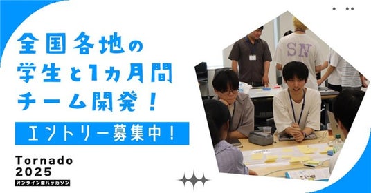 Tornado2025では、全国の学生がチームでプロジェクトを開発するオンラインハッカソンの参加者を募集しています。参加を通じて、実際のプロジェクト開発や企業との連携を体験し、社会で活躍するための貴重な経験を積むことができます。
