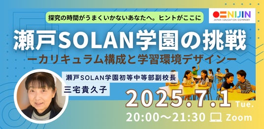 株式会社NIJIN(東京都江東区、代表取締役:星野達郎)が運営する教育コミュニティ「NIJIN教育ラボ」は、2025年7月1日(火)に、瀬戸SOLAN学園(愛知県瀬戸市)の副校長・三宅貴久子氏を講師に迎え、オンラインイベント『瀬戸SOLAN学園の挑戦 ― カリキュラム構成と学習環境デザイン ―』を開催いたします。