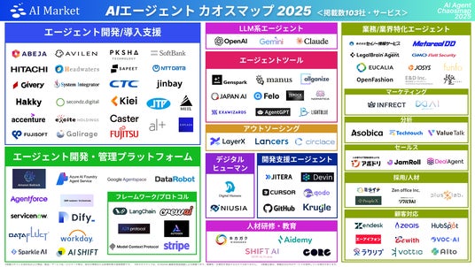 ChatGPT・Gemini・Claudeなどの進化を背景に拡大するAIエージェント領域を、導入・開発・運用の視点から103社・サービスを15カテゴリに体系化・整理した実践的カオスマップを公開