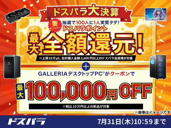 「ドスパラ大決算」は、公式通販サイトでは6月27日から7月31日10:59まで、店舗では6月27日から7月30日閉店まで開催されている。購入前には会員登録とエントリーが必要なので忘れずに。