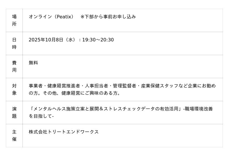株式会社トリートエンドワークス(所在地:東京都渋谷区、 代表取締役:藤井将光)は、「健康経営 事例紹介セミナー」を2025年10月8日(水)19時30分~20時30分にオンライン開催いたします。本セミナーは、企業の健康経営の重要ポイント「メンタルヘルス領域」に焦点を当てた「ストレスチェックや職場環境改善」に関する内容です。主に事業者や健康経営推進者・人事担当者・管理監督者・産業保健スタッフなど企業にお勤めの方を対象に企画しています。その他、健康経営やメンタルヘルス対策にご興味のある方もお気軽にご参加ください。
