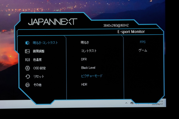 JN-IPS27G1632UF-HSPのOSDメニューで利用できるものは、画面の明るさ・コントラストのほか、画質調整、色温度、OSD設定、リセットなど。メニューの操作については、右側の底面にあるボタンで行なう。OSD用のボタンは、手を伸ばして操作しやすい配置と、確かな押下感が評価のポイントになっている。