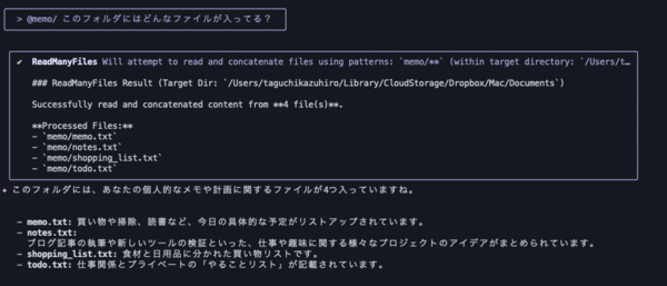 使用例:@memo/ このフォルダにはどんなファイルが入ってる?