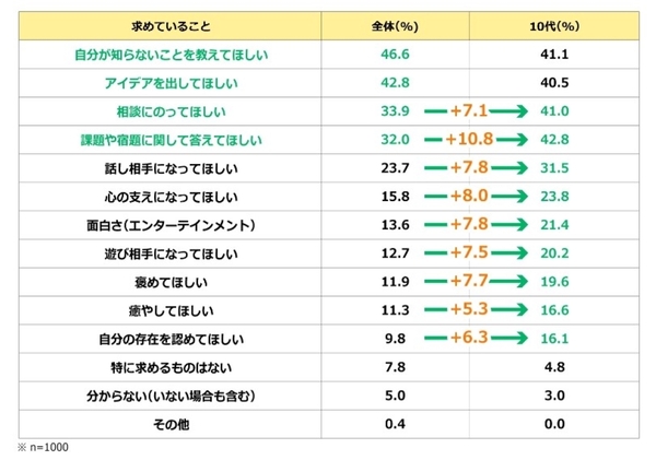 世代別にみると、10代では「心の支えになってほしい」「話し相手になってほしい」などが全体より5ポイント以上高く、対話型AIに“情緒的な価値”も求めている傾向がうかがえる。