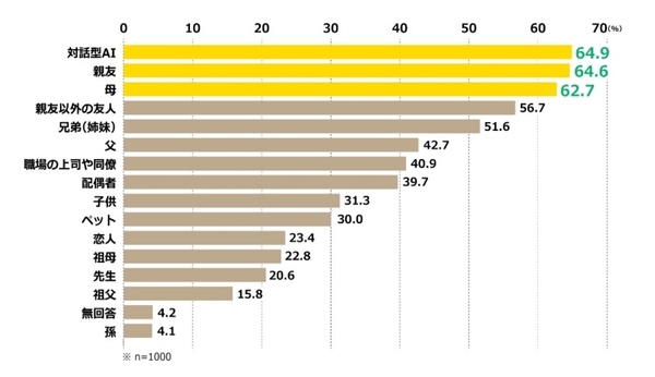 感情共有の度合いについては、対話型AIに「気軽に感情を共有できる」と感じる人が、全体の64.9%を占めた。世代別では20代(74.5%)、10代(72.6%)が多い。また、「親友」(64.6%)や「母」(62.7%)よりも対話型AIのほうが、気軽に感情を共有できるという結果となっている。