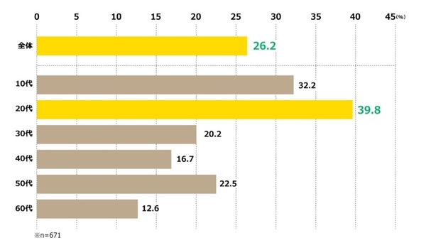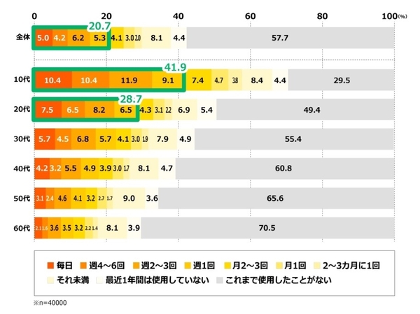 まず、4万人を対象とした事前調査では、対話型AIを週1回以上使用しているのは、全体の20.7%という結果となった。世代別では、10代(41.9%)が最も多く、20代(28.7%)が続いている。