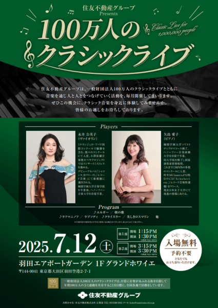 住友不動産グループは、4月より一般財団法人100万人のクラシックライブと連携し、プロの演奏家によるクラシック音楽を身近に楽しめる「住友不動産グループ presents 100万人のクラシックライブ」を毎月開催している。