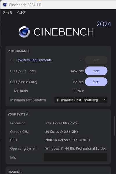 まず、CPUのパフォーマンスを測るためCINEBENCH 2024を実行したところ、マルチコアが1452pts、シングルコアが135ptsだった。シングルコアの性能が高いのが印象的だが、マルチコアも順当に進化している。