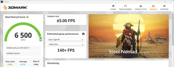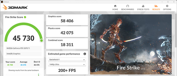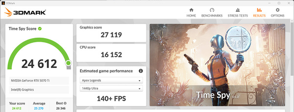 ミドルハイクラスのRTX 5070 Tiを搭載しているだけあって非常に優秀なスコア。前世代の上位モデルRTX 4080と比べても同等以上なので、GPUアクセラレーションを使う処理や動画のエンコードなどもそれだけ快適に行えることが期待できる。