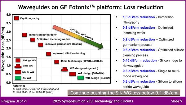 当初の90WG(昔は9WGと言われていたが、90nm SOIウェハーを利用したもの)に普通に露光→エッチングしただけでは導波経路のロスが4dB/cmとけっこう大きかったのが、細かな改良やプロセスの微細化(90WG→45CLO)、さらにデザインの改善などを積み重ねることで3.65dB/cmほど削減しているとする。