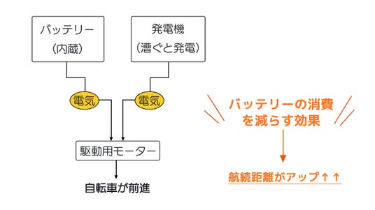 リアキャリアに本機専用のコンバーターキットを搭載することにより、50RPMから100RPMのケイデンスで発電機を回すことで、発電機はバッテリーと同程度の電圧を生成することが可能となりました。50RPMから100RPMのケイデンスはゆっくり自転車をこぐくらいのスピードです。ペダルの重さは必要な電力により変化しますが、ギヤなしの自転車を平坦な場所で漕ぐくらいの負荷となります。600W高性能モーターを搭載することで、街乗りから坂道まで、快適な走行を実現します。