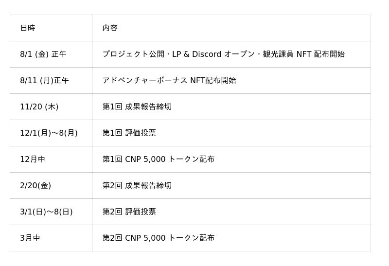 本施策では、市内外在住の“加西市ファン”が NFT を起点に Discord コミュニティへ参加。自ら企画・実行した観光 PR 活動の成果に応じて、※CNP トークン総額約 100 万円分を報酬として受け取れる仕組みを導入し、双方向の関係人口創出を目指します。